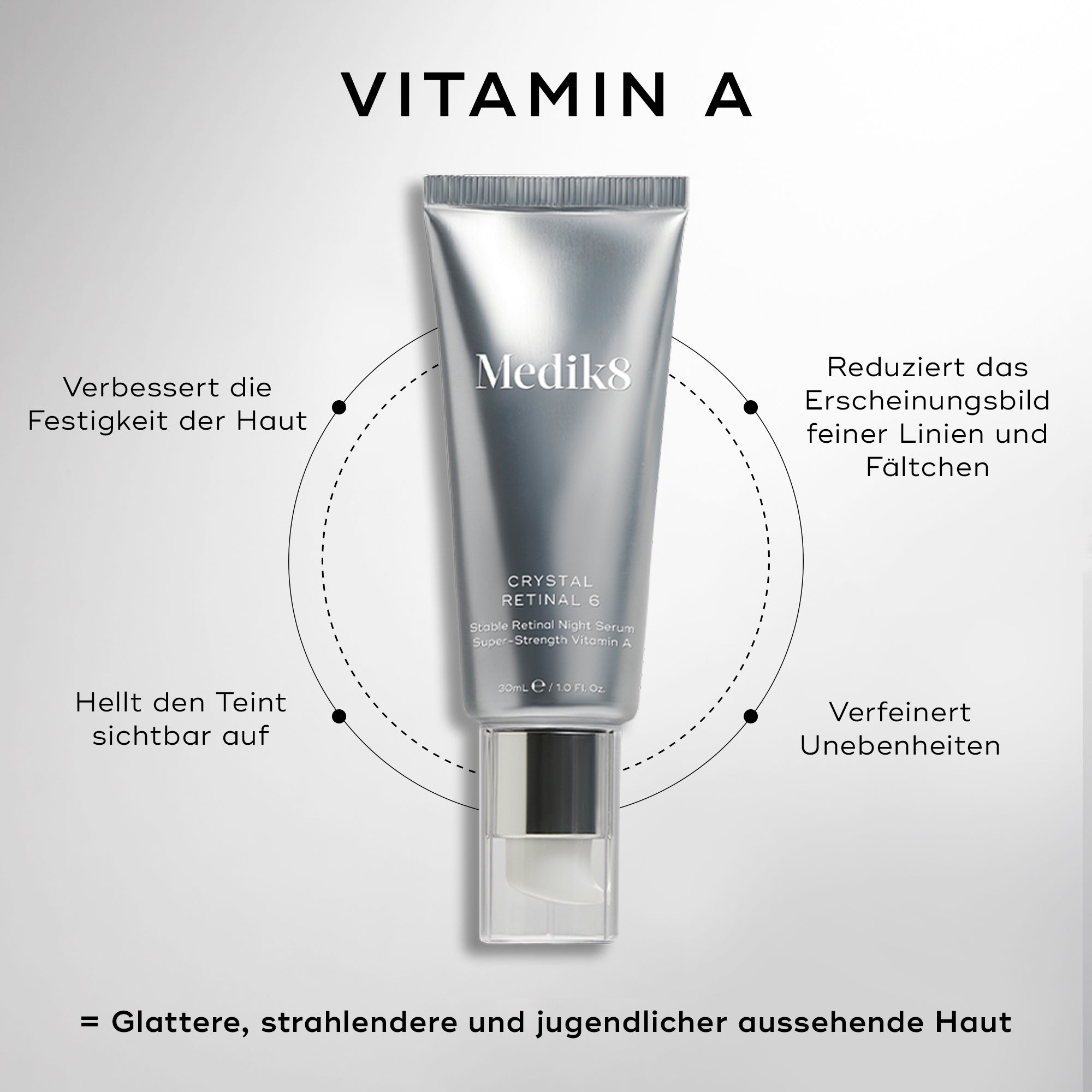 Bei Medik8 arbeiten wir mit drei bewährten Vitamin-A-Formen: Retinol, Retinaldehyd (Retinal) und Retinylretinoat.