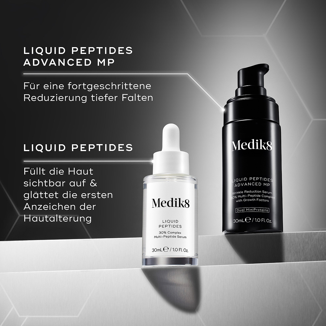 Beide Produkte bekämpfen die Zeichen der Hautalterung, können aber in unterschiedlichen Phasen der Hautpflege verwendet werden. Liquid Peptides Advanced MP ist ideal, um fortgeschrittene Anzeichen der Hautalterung zu bekämpfen, während Liquid Peptides entwickelt wurde, um feine Linien sichtbar aufzufüllen und zu glätten.