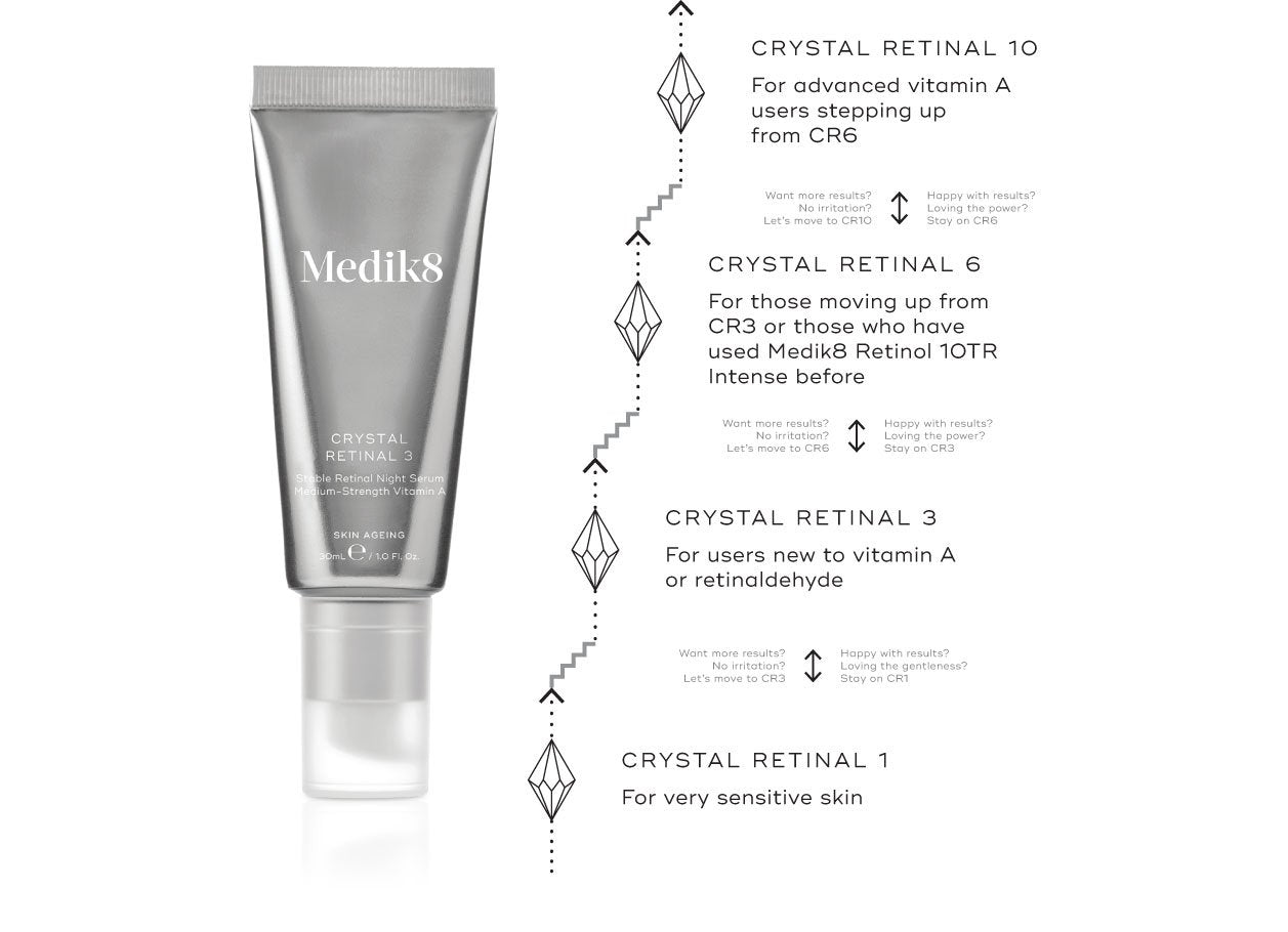 Wir nennen es "das Vitamin A für jeden", weil das aufgrund der fünf erhältlichen Stärken auch tatsächlich der Fall ist. Wenn Sie nach einem Vitamin A suchen, ist Crystal Retinal® das Richtige für Sie. Wir empfehlen, bei Stärke 3 einzusteigen und diese dann Schritt für Schritt zu steigern, wenn Sie die Ergebnisse verstärken möchten. (Für Personen mit sehr empfindlicher Haut empfehlen wir jedoch Stärke 1). Hier erfahren Sie, wie Sie Crystal Retinal peu à peu in Ihre Hautpflegeroutine integrieren können .